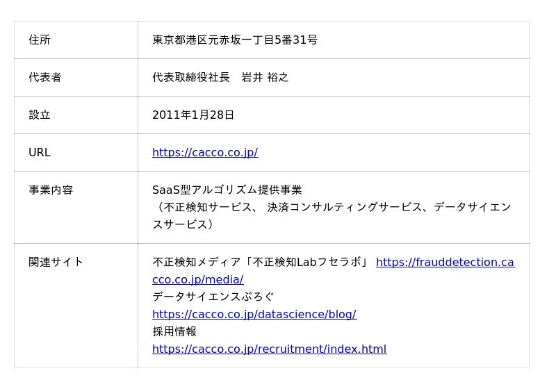 Caccoは、「未来のゲームチェンジャーの『まずやってみよう』をカタチに」という経営ビジョンを掲げ、セキュリティ・ペイメント・データサイエンス技術をもとに、アルゴリズム及びソフトウエアを開発・提供し企業の課題解決やチャレンジを支援することを目指しております。 オンライン取引における「不正検知サービス」を中核サービスとして位置づけ、不正ログインから不正注文対策まで対応可能な国内での導入実績数No.1の不正検知サービス「O-PLUX」や金融機関や会員サイトにおける情報漏洩対策の不正アクセス検知サービス「O-MOTION」、フィッシング対策サービス等を提供しております。