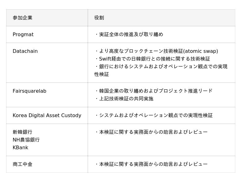 株式会社Datachain(代表取締役 CEO:久田 哲史、以下Datachain)、Progmat, Inc.(代表取締役:齊藤達哉、以下Progmat)、Fairsquarelab Co., Ltd(CEO: Joon-hong Kim、以下 Fairsquarelab)、Korea Digital Asset Custody Co., Ltd.(Co-CEO: Joon-hong Kim, Sung-il Cho、以下 Korea Digital Asset Custody)は、Swift と連携したステーブルコイン(以下 SC)のクロスボーダー送金基盤構築プロジェクト「Project Pax」に関する技術検証のフェーズ1を完了しました。また、これに伴い、韓国金融機関のフェーズ2への新規参画が決定いたしました。
