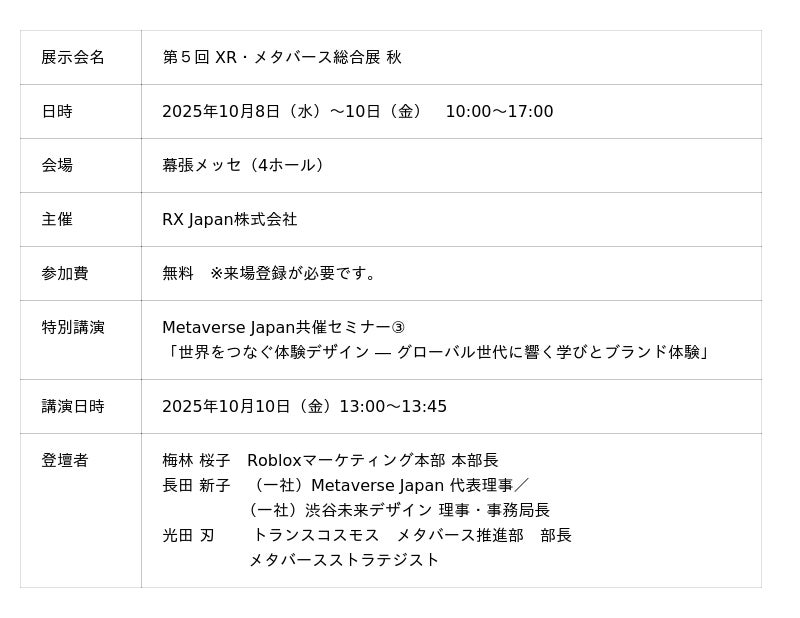 トランスコスモスは、2025年10月10日(金)に幕張メッセで開催される「第5回XR・メタバース総合展」(主催:RX Japan)において、「世界をつなぐ体験デザイン グローバル世代に響く学びとブランド体験」と題して、トランスコスモス メタバースストラテジスト光田 刃がRobloxマーケティング本部 本部長 梅林桜子氏、Metaverse Japan代表理事 長田新子氏と特別講演に登壇します。