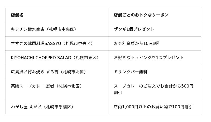 ご利用いただける店舗には、ボリューム満点のザンギが大人気の「キッチン鑓水商店」(札幌市中央区)や、栄養満点のサラダでファンが多い「KIYOHACHI CHOPPED SALAD(キヨハチチョップドサラダ)」(札幌市東区)、本格的な広島風お好み焼きが話題の「広島風お好み焼き まろ吉」(札幌市北区)など、地域の人気店が数多く含まれます。