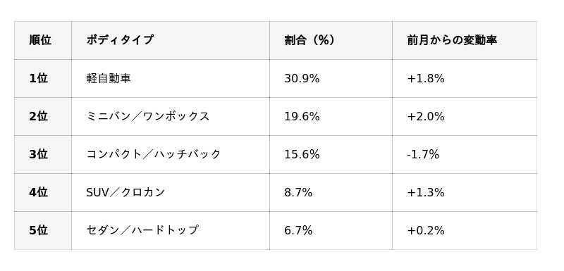 国産車ボディタイプ別買取ランキングは、1位の軽自動車から5位のセダン/ハードトップまで前月と同様でした。全体の約30%を占める軽自動車ですが、ランク外にも6位に軽バン/軽ワゴン、8位に軽RVが位置するなど、軽カテゴリー全般の人気が目立ちます。