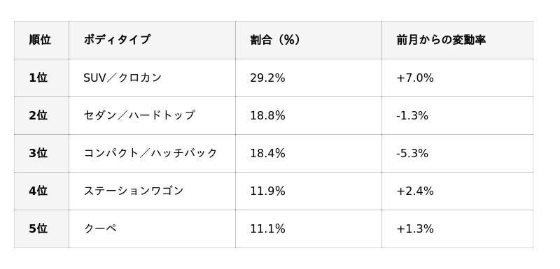 ボディタイプ別の中古車買取ランキング