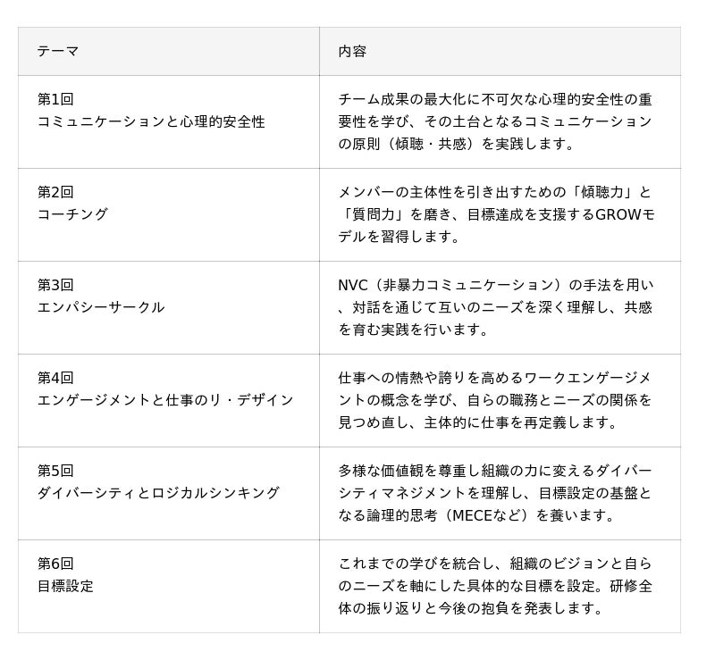 - 特徴: 研修で得た学びを現場で実践し、次回の研修でフィードバックを行うサイクルを繰り返すことに加え、受講者の上長も研修に参加し、学びを実践する業務機会を積極的に提供することで、研修効果の最大化と確実な行動変容を促します。