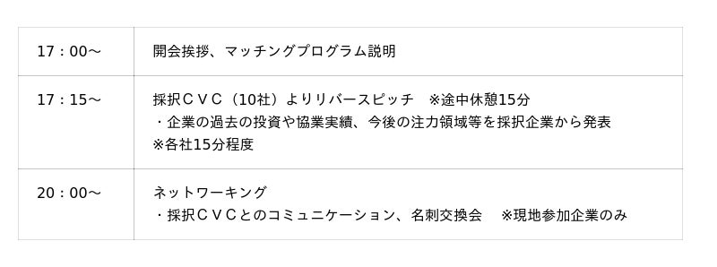 - 本事業への応募を検討されるスタートアップ・中小企業の方を対象に、マッチングプログラムの説明、採択CVCからのリバースピッチイベントを開催します。