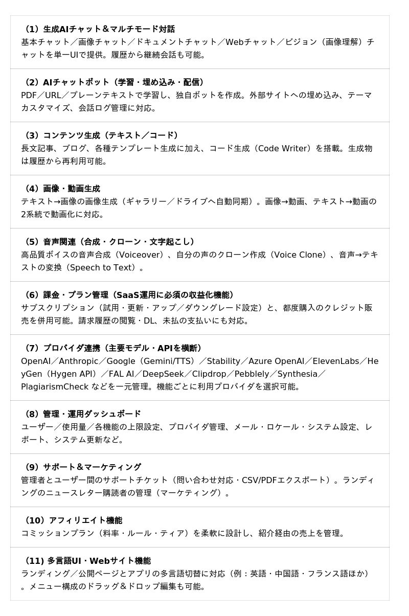 文章やビジュアルの制作、音声コンテンツの作成、動画でのプレゼンや広告素材、カスタマーサポートの自動化まで。これまで複数のツールを使い分けなければ実現できなかった業務が、「AI ONE」ひとつで完結します。