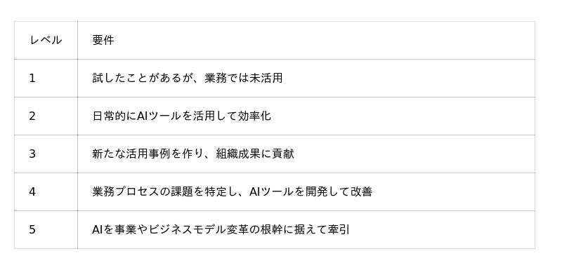 全社員を対象に、AI活用スキルを5段階に分類。基礎的なAIツールの利用から、新たな開発でグループに貢献する段階までを定義しました。2025年9月末までに、全社員がレベル2「既存のAIツールを日常的に活用し、業務効率化を実現」に到達することを目標に、TAが旗振りを推進しました。