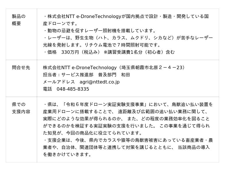 県では、ドローンの社会受容性向上を図り、県内へのドローン実用化・普及を促進するため、全国から有望なドローンの開発・実証実験に取り組むプロジェクトを公募し、開発から実用化に向けた総合的な支援を行っています。 このたび、令和6年度「ドローン実証実験プロジェクト」で支援した鳥獣害被害対策ドローンが商品化されましたので、お知らせします。