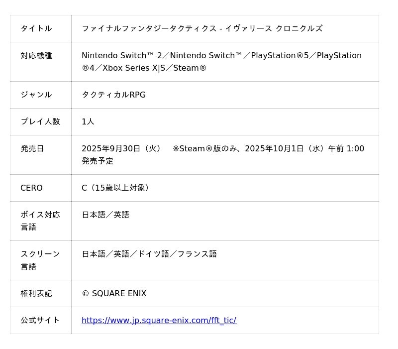 株式会社スクウェア・エニックス(本社:東京都新宿区、代表取締役社長:桐生 隆司)は、タクティカルRPG『ファイナルファンタジータクティクス - イヴァリース クロニクルズ』を本日発売しました。