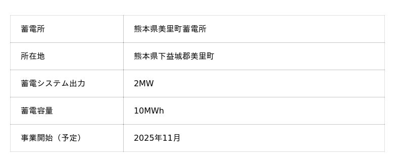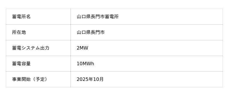 本蓄電所は、山口県長門市と熊本県下益城郡美里町に設置されており、それぞれ2025年10月、2025年11月の運転開始を予定しています。送配電網に直接接続し時間帯に応じて充放電を行うことで、天候や時間帯の影響を受けず継続的に再生可能エネルギーの供給が可能になると同時に、電力需給バランスの調整機能という重要な役割を担うこととなります。