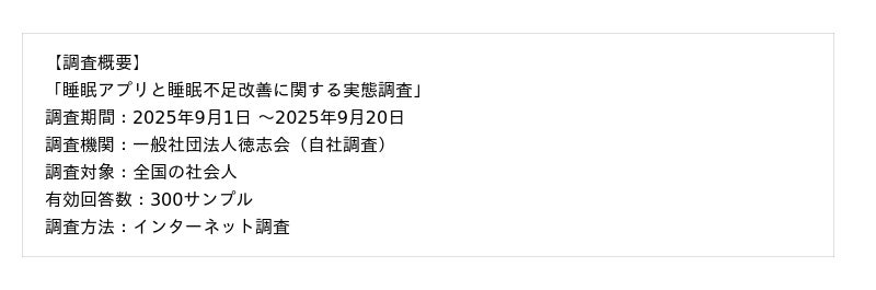 一般社団法人徳志会(所在地:東京都品川区、代表理事:河口雅弘)は、心療内科・精神科クリニックである新宿心療内科よりそいメタルクリニック(新宿駅東口徒歩3分)横浜心療内科よりそいメタルクリニック(横浜駅西口徒歩2分)柏心療内科よりそいメンタルクリニック(柏駅徒歩0分、2025年10月オープン予定)を運営し皆様のメンタルヘルスをサポートしております。今回はうつ病のリスク軽減のために睡眠アプリを使った睡眠不足の解消に関して調査を実施したので、その結果を紹介します。