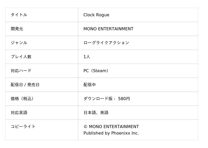 株式会社Phoenixx(フィーニックス)(東京都武蔵野市、代表取締役社長:坂本 和則)は、体内時計で戦う新感覚ローグライクアクションゲーム、『Clock Rogue』のパブリッシャーがPhoenixxに決定した事をお知らせいたします。