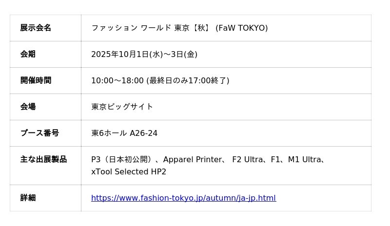 「革新的なツールで、創造性を次のステージへ」をミッションに掲げるxTool(本社:中国・深圳市 Makeblock Co., Ltd.、代表取締役:王建軍)は、2025年10月1日(水)より東京ビッグサイトで開催される日本最大のファッション総合展「ファッション ワールド 東京【秋】」に出展いたします。