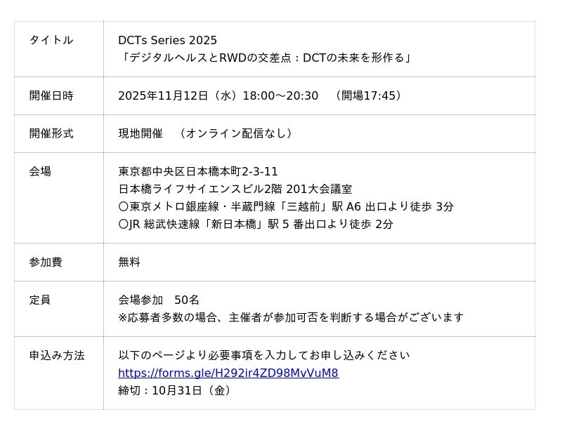 第4弾となる今回は、11月12日(水)18時~東京日本橋にて「デジタルヘルスとRWDの交差点:DCTの未来を形作る」をテーマに開催いたします。