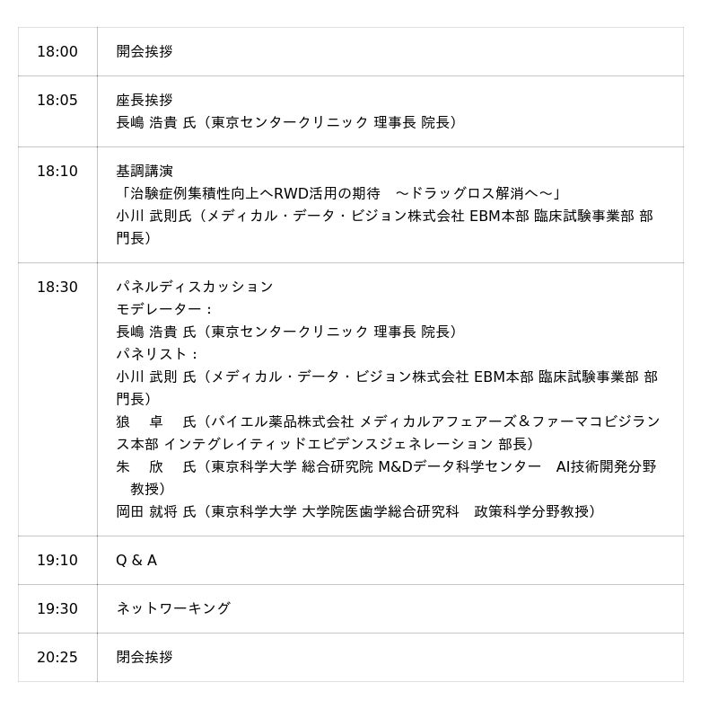 医療データ企業、製薬企業、医療機関、アカデミアの代表者が一堂に会し、臨床試験における「リアルワールドデータ」の活用や課題、DCTの設計や信頼性をどう支えるか等、今後の展望についてお話しいただきます。また、イベント後半は、来場者も含めたディスカッションと、参加者同士のつながりを深めるためのネットワーキングの機会を設けています。