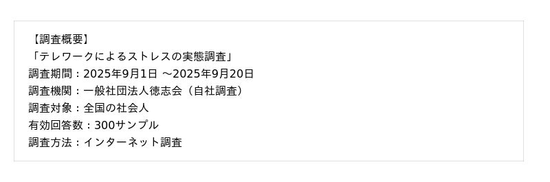 一般社団法人徳志会は、全国の社会人を対象にテレワークによるストレスに関するアンケート調査を実施しました。