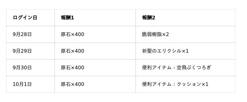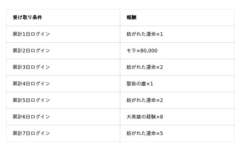 イベント期間中にログインすると、累計ログイン日数によって各種報酬を受け取ることができます。
