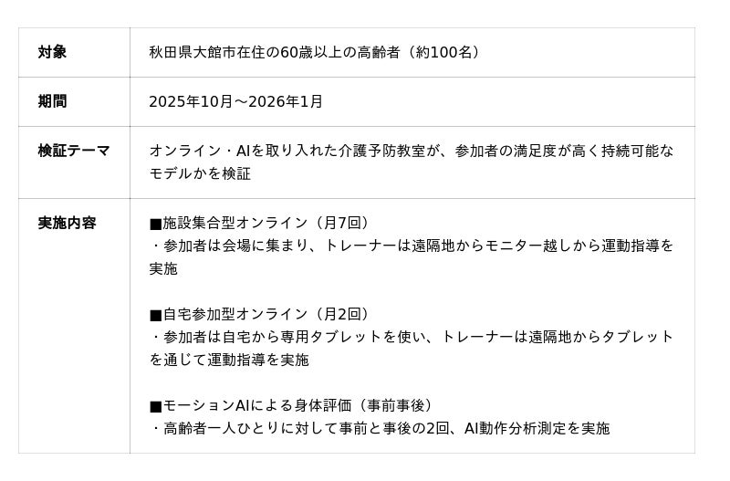 本実証実験は、60歳以上の高齢者約100名を対象に、遠隔地のトレーナーとモニター越しにコミュニケーションを取りながら実施するオンライン体操と、参加者の動作データをAIで解析して身体評価を行うツールを活用し、最適な運動プログラムを提供するものです。