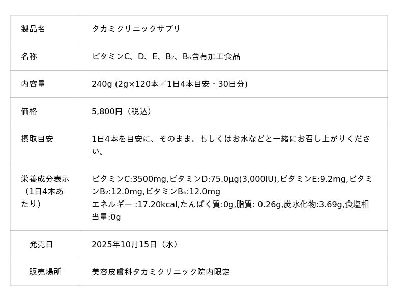 takamiclinic.or.jp )は、その26年間の臨床経験で培った知見を結集し、美しさの土台を内側から支えるビタミンサプリメント『タカミクリニックサプリ』を、2025年10月15日(水)より院内にて提供を開始いたします。 これは、私たちの長年の経験から生まれた「こだわり」をかたちにしたインナーケア。 今の肌悩みに寄り添いながら未来の自信を育む、新しい美肌習慣です。