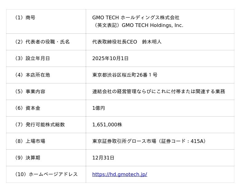 GMOインターネットグループでインターネット集客事業やインターネットメディア事業等を展開するGMO TECHホールディングス株式会社(代表取締役社長CEO:鈴木 明人 以下、GMO TECHホールディングス)は、GMO TECH株式会社(代表取締役社長:鈴木 亮一 以下、GMO TECH)とGMOデザインワン株式会社(代表取締役社長:高畠 靖雄 以下、GMOデザインワン)の共同株式移転により、本日2025年10月1日(水)に設立され、東京証券取引所グロース市場に上場いたしました。これに伴い、当社グループは企業価値の最大化を目的として、持株会社体制へと移行いたします。
