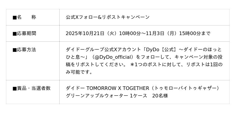 ダイドー TOMORROW X TOGETHER(トゥモローバイトゥギャザー)グリーンアップルウォーターの発売を記念して、ダイドーグループ公式Xアカウント「ダイドーのほっとひと息」をフォローして対象ポストをリポストするだけで、本商品が抽選で当たる「公式Xフォロー&リポストキャンペーン」を実施いたします。
