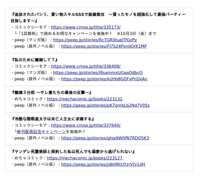 『離婚3分前 ~サレ妻たちの最後の反撃~』『ヤンデレ死霊術師と契約した私は死んでも溺愛から逃げられない』がめちゃコミックの人気漫画 急上昇ランキングにて1位を獲得するなど、早くも大きな反響を呼んでいます。