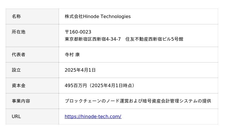 gumiの子会社であるgC LabsとTISとの合弁会社であるHinode Technologiesは、ブロックチェーン技術を活用した分散型社会の実現に向け、「新技術を用いた社会実装を推進することで世界に誇れるシステムインフラを構築し、持続可能な未来を切り拓く」をミッションにWeb3の基盤となるブロックチェーンのノード運営事業を主業として取り組んでおります。将来的には暗号資産の会計管理システム等販売事業も展開する予定です。
