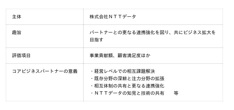 コアビジネスパートナーは、NTTデータと経営層一体となり共同でビジネス拡大を推進するパートナーです。当社は柔軟性に富んだ体制構築力やシステム開発による事業貢献度、求められる顧客満足度水準等が総合評価されて認定に至りました。