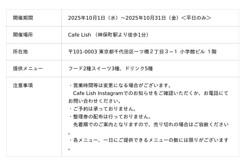 株式会社ノンピ(本社:東京都千代田区、代表取締役社長:上形秀一郎)は、2025年10月1日(水)から9月26日(金)までの期間限定で、小学館ビル1階の「Cafe Lish(カフェ リッシュ)」にてコラボレーション企画を実施いたします。本企画は、株式会社小学館(本社:東京都千代田区、代表取締役社長:相賀信宏)が発行する漫画雑誌『週刊少年サンデー』による大型ファンイベント「サンデー文化祭」の連動企画として開催いたします。