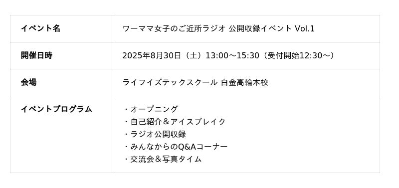 株式会社MILY(本社:東京都港区、代表取締役:村田 あつみ)は、2025年8月30日(土)、ライフイズテック スクール 白金高輪本校にて「ワーママ女子のご近所ラジオ 公開収録イベント Vol.1」を開催しました。