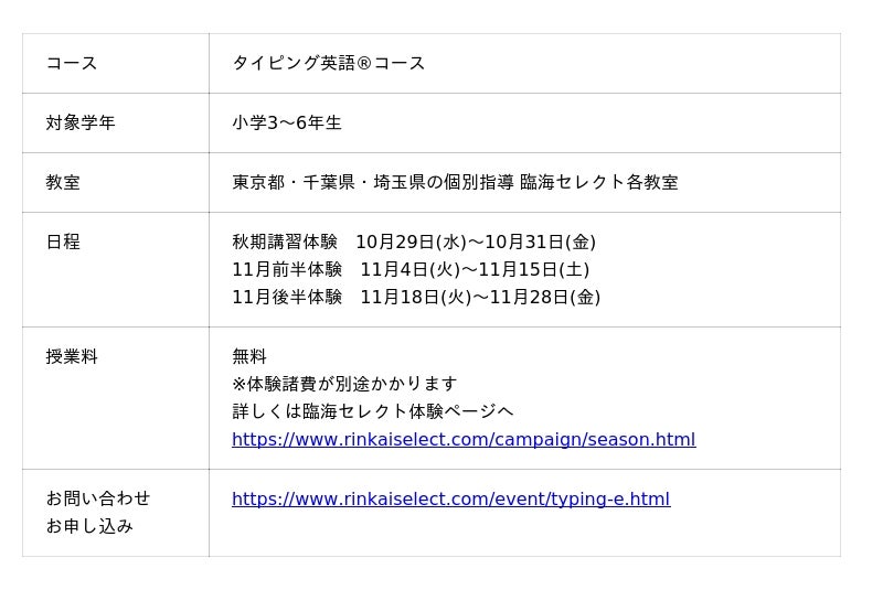 株式会社臨海(本社:神奈川県横浜市)が運営する個別指導 臨海セレクトは、東京・埼玉・千葉の教室にて、小学3~6年生を対象に、子どもが楽しく英語学習に取り組める"タイピング×英語学習プログラム"をスタートします。