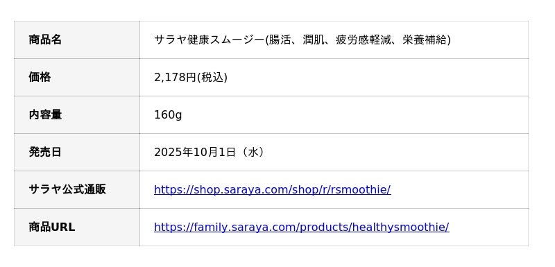 サラヤ株式会社(本社:大阪/代表取締役社長:更家悠介)は、「サラヤ健康スムージー」を2025年10月1日(水)よりサラヤ公式通販限定で発売することをお知らせいたします。