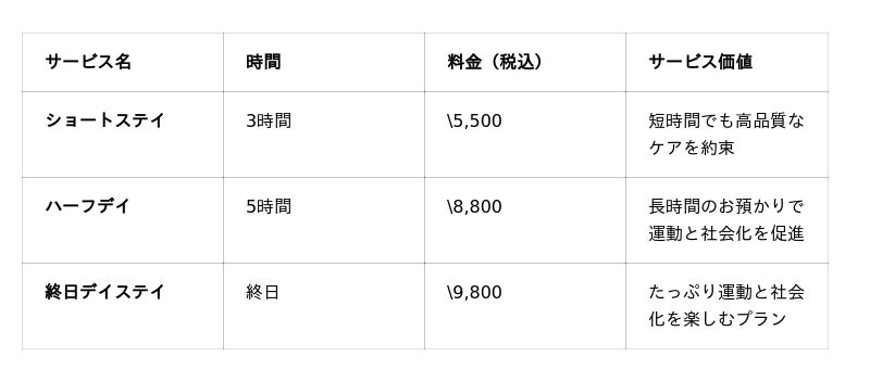- 環境の質:都心随一の広さを誇る室内ドッグランでのケージフリーな自由運動。- プロの質:プロの視点による個性に合わせた運動発散と休憩の提供。- 安心感の質:健康観察に加え、他の犬との接し方から分かる個性や特徴を日記で報告。