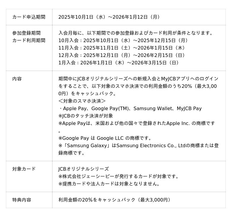 株式会社ジェーシービー (本社:東京都港区、代表取締役会長兼執行役員社長:二重 孝好、以下:JCB)は、2025年10月1日(水)から2026年1月12日(月)の間、「JCBオリジナルシリーズ新規入会者限定スマホ決済利用で20%キャッシュバックキャンペーン」を実施します。