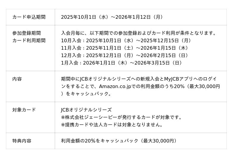 株式会社ジェーシービー (本社:東京都港区、代表取締役会長兼執行役員社長:二重 孝好、以下:JCB)は、2025年10月1日(水)から2026年1月12日(月)の間、「JCBオリジナルシリーズ新規入会者限定Amazon.co.jp利用で20%キャッシュバックキャンペーン」を実施します。