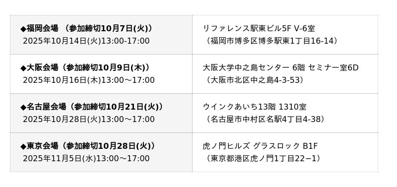 - 福岡(10/14)・大阪(10/16)・名古屋(10/28)・東京(11/5)-
