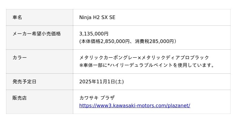 株式会社カワサキモータースジャパン(本社:兵庫県明石市、代表取締役社長:佐伯 健児)は、「Ninja H2 SX SE」のカラー&グラフィックを変更し、2025年11月1日(土)に発売いたします。