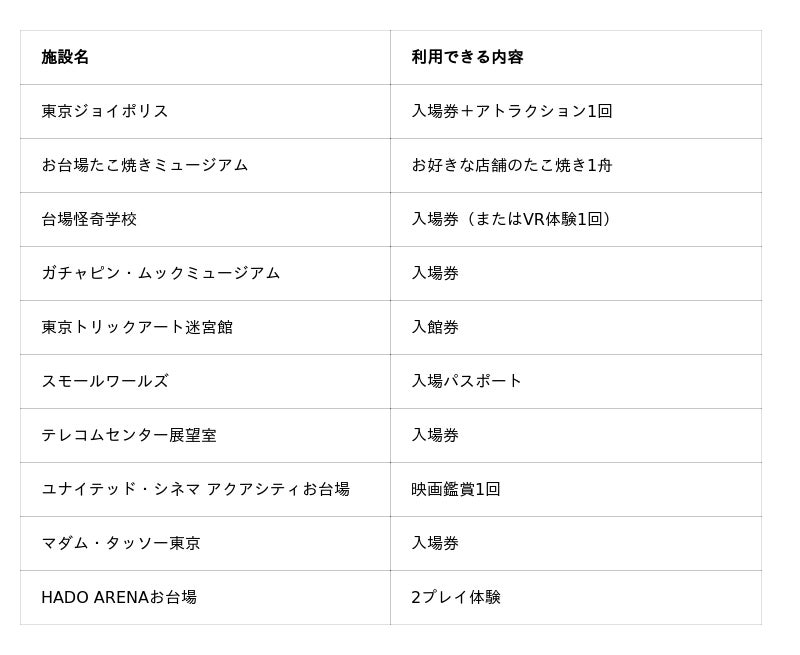 今回のリニューアルでは、利用できる施設が決まっていた従来の固定プランに加え、参画している10施設から自由に利用施設を選択できる「チョイスプラン」を初導入し、お客様の興味や滞在時間に合わせたカスタマイズが可能となります。また、より多くのお客様にお台場観光をお楽しみいただけるよう、価格設定も全面的に見直しました。