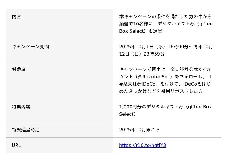 楽天証券株式会社(本社:東京都港区、代表取締役社長:楠 雄治、以下「楽天証券」)は、2025年8月末時点で、iDeCo(個人型確定拠出年金、以下「iDeCo」)の加入者数(※)が100万人を突破したことをお知らせします。また、加入者数(※)100万人突破を記念して、本日、2025年10月1日(水)より、楽天証券公式Xアカウントをフォローし、iDeCoを始めたきっかけなどを引用リポストで投稿いただいた方から、抽選で10名様に1,000円分のギフト券を進呈するキャンペーンを開始したことを、あわせてお知らせします。