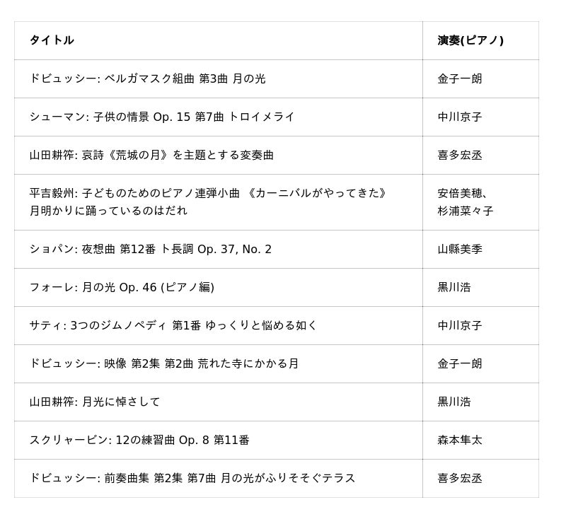 古今東西の作曲家による「月」をイメージしたピアノ曲を集め、幻想的で静謐な響きをお楽しみいただける内容となっており、Apple MusicやSpotifyなどの各配信サービスでリリースされています。