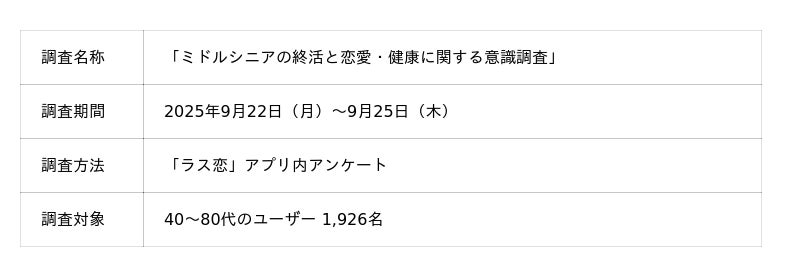 株式会社ラス恋(アイザックグループ/本社:東京都渋谷区/代表取締役CEO:山口 昂星)が運営する、対象年齢が40歳以上の恋活・婚活マッチングアプリ「ラス恋」は、2025年9月、40~80代の「ラス恋」ユーザー1,926名を対象に「終活と恋愛・健康」に関する意識調査を実施しました。