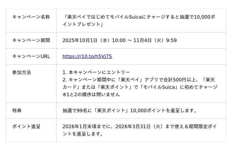 本キャンペーンでは、エントリーのうえ、キャンペーン期間中に「楽天ペイ」アプリ内で合計500円以上、「楽天カード」または「楽天ポイント」から初めて「モバイルSuica」にチャージされた方の中から、抽選で99名に10,000ポイントの「楽天ポイント」を進呈します(注1)。