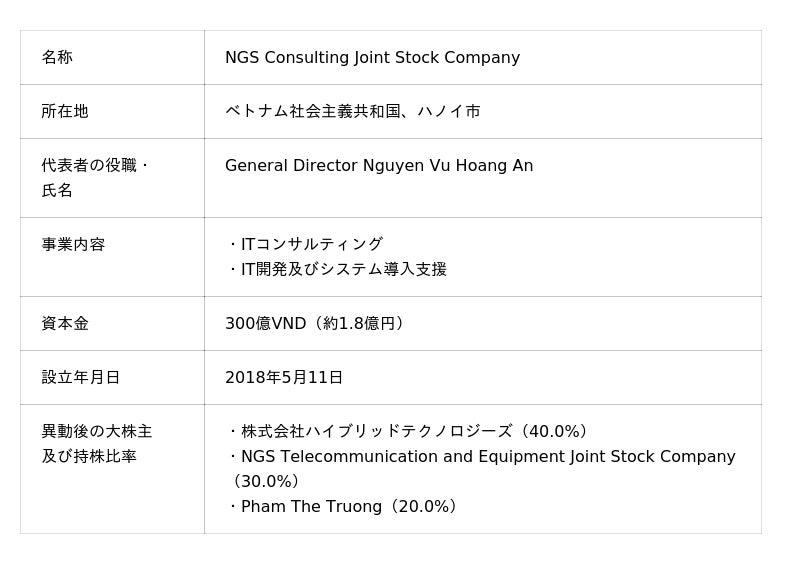 当社が2025年4月30日に開示した「(開示事項の経過)ベトナム国内への事業展開に向けたNGSC社の株式取得(連結子会社化)に係る株式譲渡契約締結、及びベトナム合弁会社設立の中止に関するお知らせ」、及び2025年7月31日に開示した「(開示事項の変更)ベトナム国内への事業展開に向けたNGSC社の株式取得(連結子会社化)に係る株式譲渡実行日の変更に関するお知らせ」にてお知らせした、NGS Consulting Joint Stock Company(以下、NGSC社)の株式取得(連結子会社化)に関して、本日株式取得が完了し、同社を連結子会社化いたしましたので、お知らせいたします。