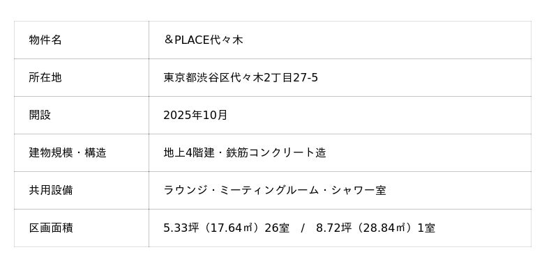 第一弾物件は東京都渋谷区代々木2丁目に位置する築31年の元社員寮をフルリノベーションし、『&PLACE 代々木』として2025年10月より開設いたします。