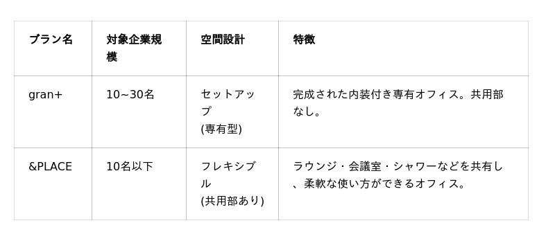 『&PLACE』は、専有部と共用ラウンジを組み合わせたラウンジ付きフレキシブルワークプレイスで、小規模スタートアップを主な対象としています。既存ブランド「gran+」と異なるポジションを担い、企業の成長ステージに応じた拠点を提供してまいります。
