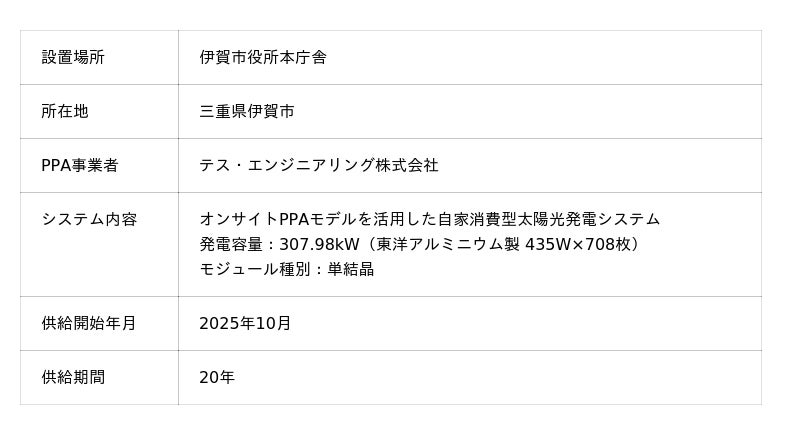 テスホールディングス株式会社(本社:大阪市淀川区、代表取締役社長:山本 一樹、以下「当社」)は、連結子会社であるテス・エンジニアリング株式会社(本社:大阪市淀川区、代表取締役社長:高崎 敏宏、以下「テス・エンジニアリング」)が、三重県伊賀市(市長:稲森 稔尚、以下「伊賀市」)の伊賀市役所本庁舎向けに、オンサイトPPAモデル※1を活用した自家消費型太陽光発電システムによる再生可能エネルギー電気の供給(以下「本事業」)を2025年10月より開始いたしましたのでお知らせいたします。