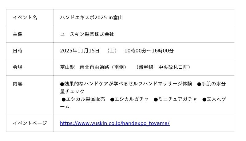 ユースキン製薬株式会社(本社/神奈川県川崎市 代表取締役社長/野渡毅之)は、ハンドケアの普及啓発のためのイベント「ハンドエキスポ」を、2025年11月15日(土)に富山駅 南北自由通路(南側)にて、開催します。