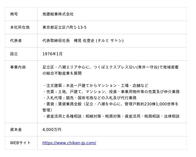 注文住宅および大型建築物の施工・不動産開発を手掛ける、広島建設株式会社(本社:千葉県柏市、代表取締役:島田 秀貴)は、2025年9月30日付けで、総合不動産業を営む「地建総業株式会社(所在地:東京都足立区、代表取締役社長:樽見 佐登史)」の全株式を取得し、グループ会社となりましたことをお知らせします。
