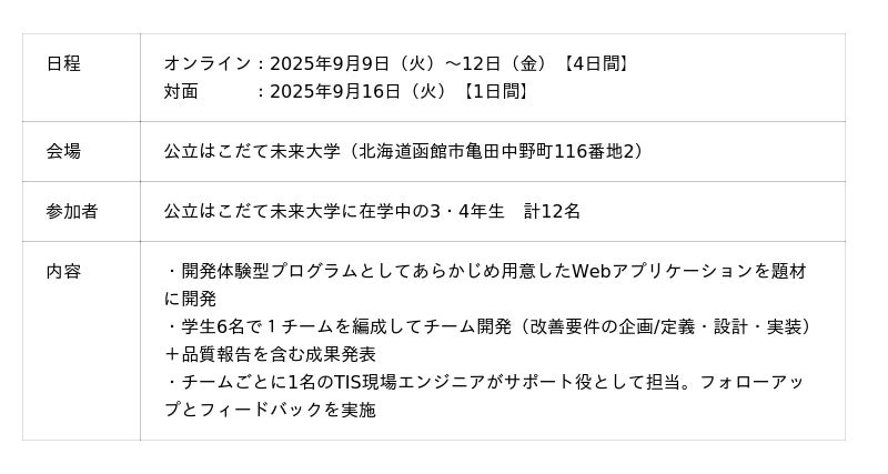 TISインテックグループのTIS株式会社(本社:東京都新宿区、代表取締役社長:岡本 安史、以下:TIS)と公立はこだて未来大学(所在地:北海道函館市、理事長:鈴木 恵二)は、2025年9月9日から16日にかけて、オンライン形式および公立はこだて未来大学キャンパスで、学生向けの職業体験イベントである「開発体感セミナー(アプリケーション開発コース)」を共同開催したことを発表します。企業のエンジニアが地方大学を訪問して学生と直接の接点を持ち、システム開発体験を通じたキャリア支援機会を提供する取り組みは業界内でも前例が少なく、TISにとって初めての取り組みとなります。