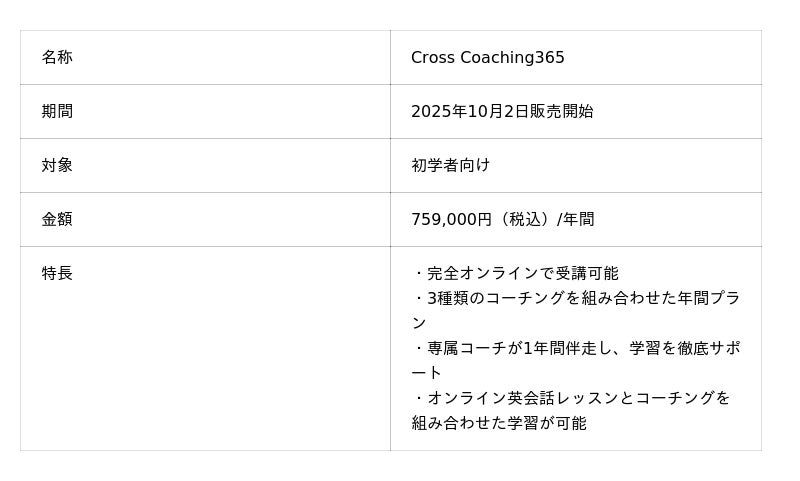 産経ヒューマンラーニング株式会社(本社:東京都新宿区、代表取締役:中谷友紀、以下「当社」)は、2025年10月2日(木)より、オンライン英会話コーチングの年間プラン「Cross Coaching365」の販売を開始します。