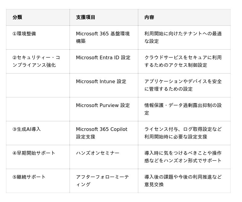 必要な環境整備・セキュリティー設定・ハンズオン支援・導入後のフォローまでをワンパッケージで提供。企業内情報の流出リスクを担保し、安心・安全・迅速にMicrosoft 365 Copilot導入を支援します。